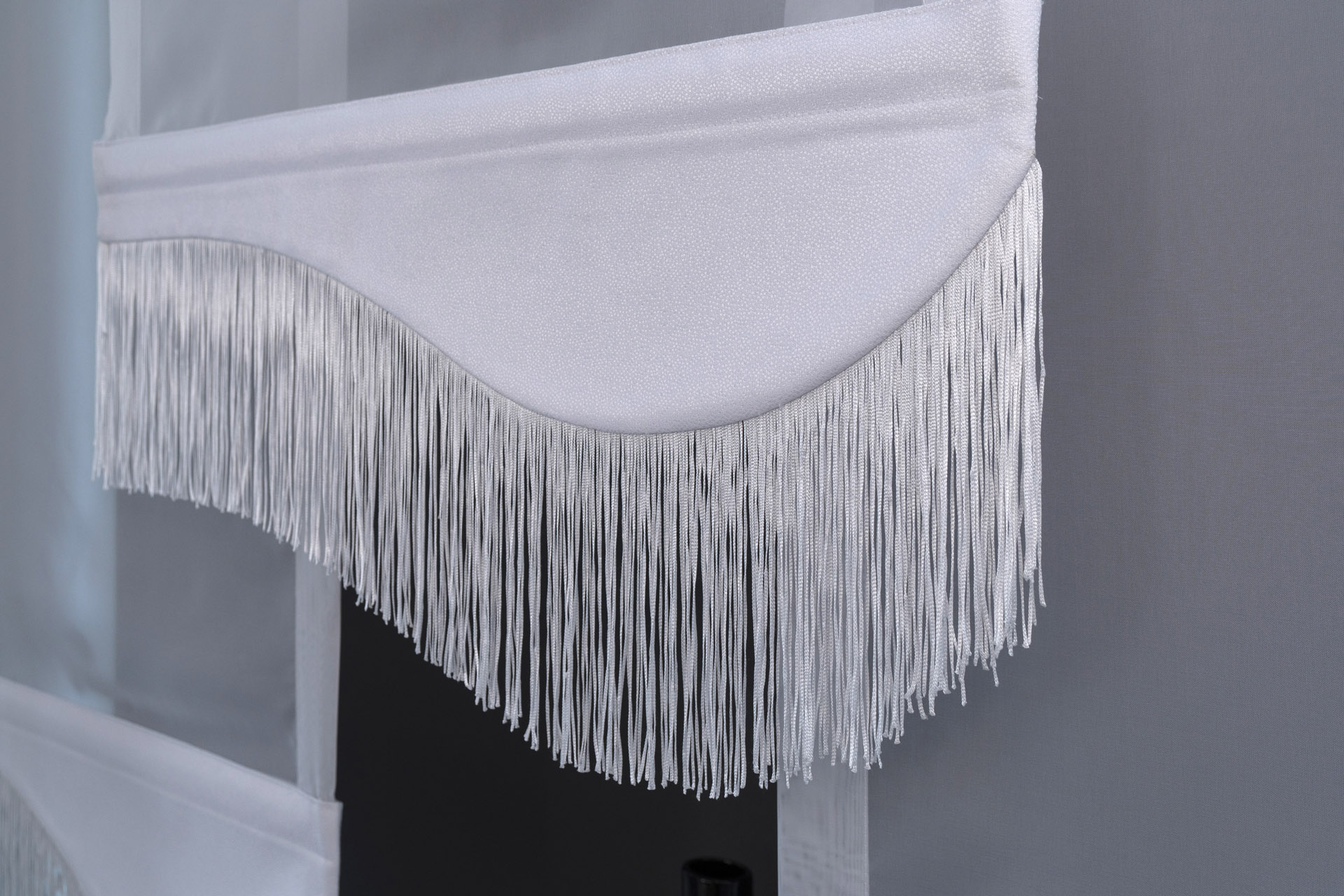 - Doszyte białe frędzle do dolnej plisy nadają tej stylizacji prawdziwie finezyjny charakter tworząc ponadczasową elegancje.