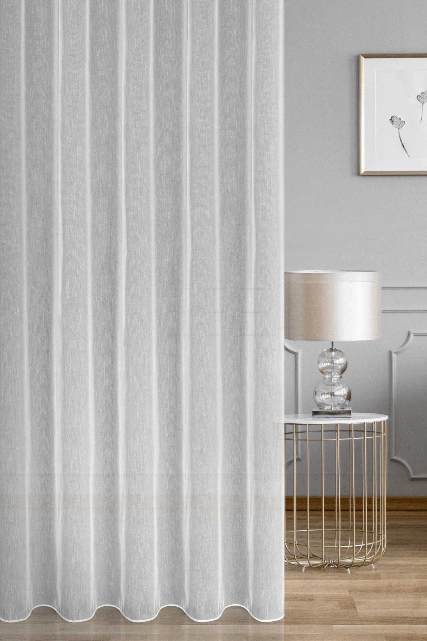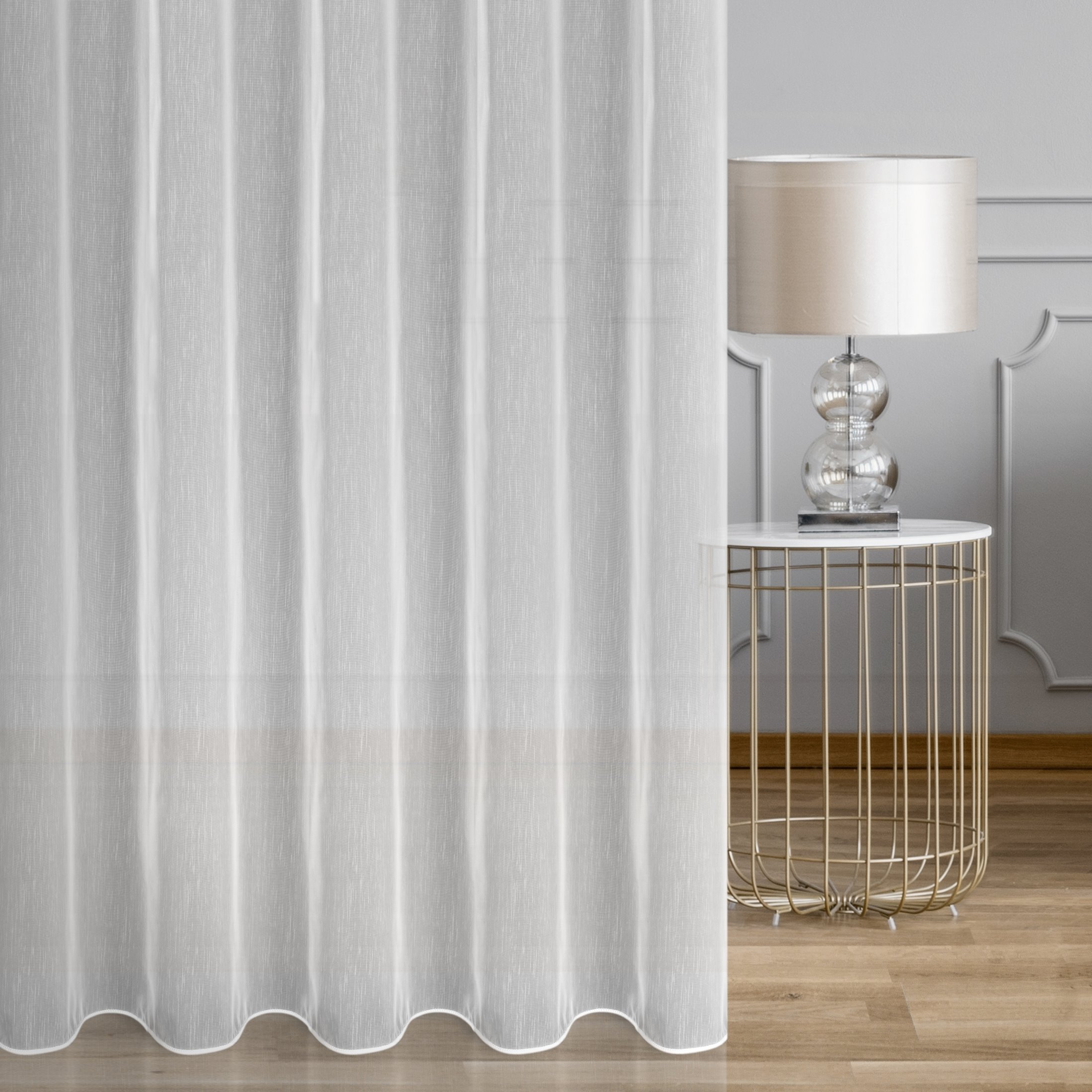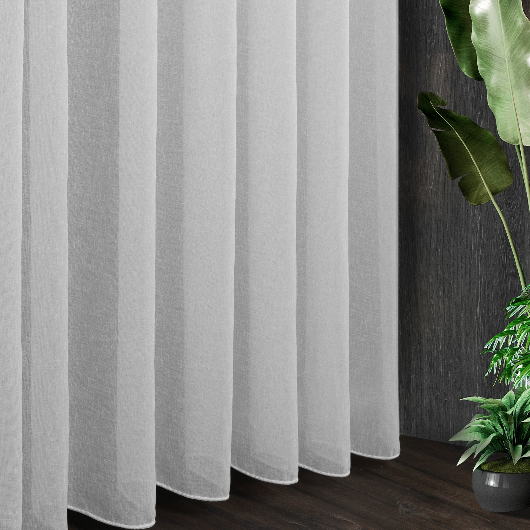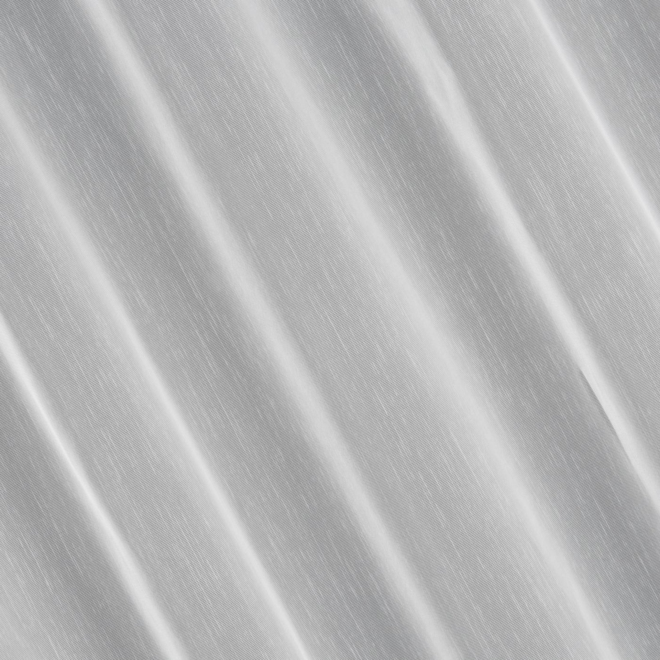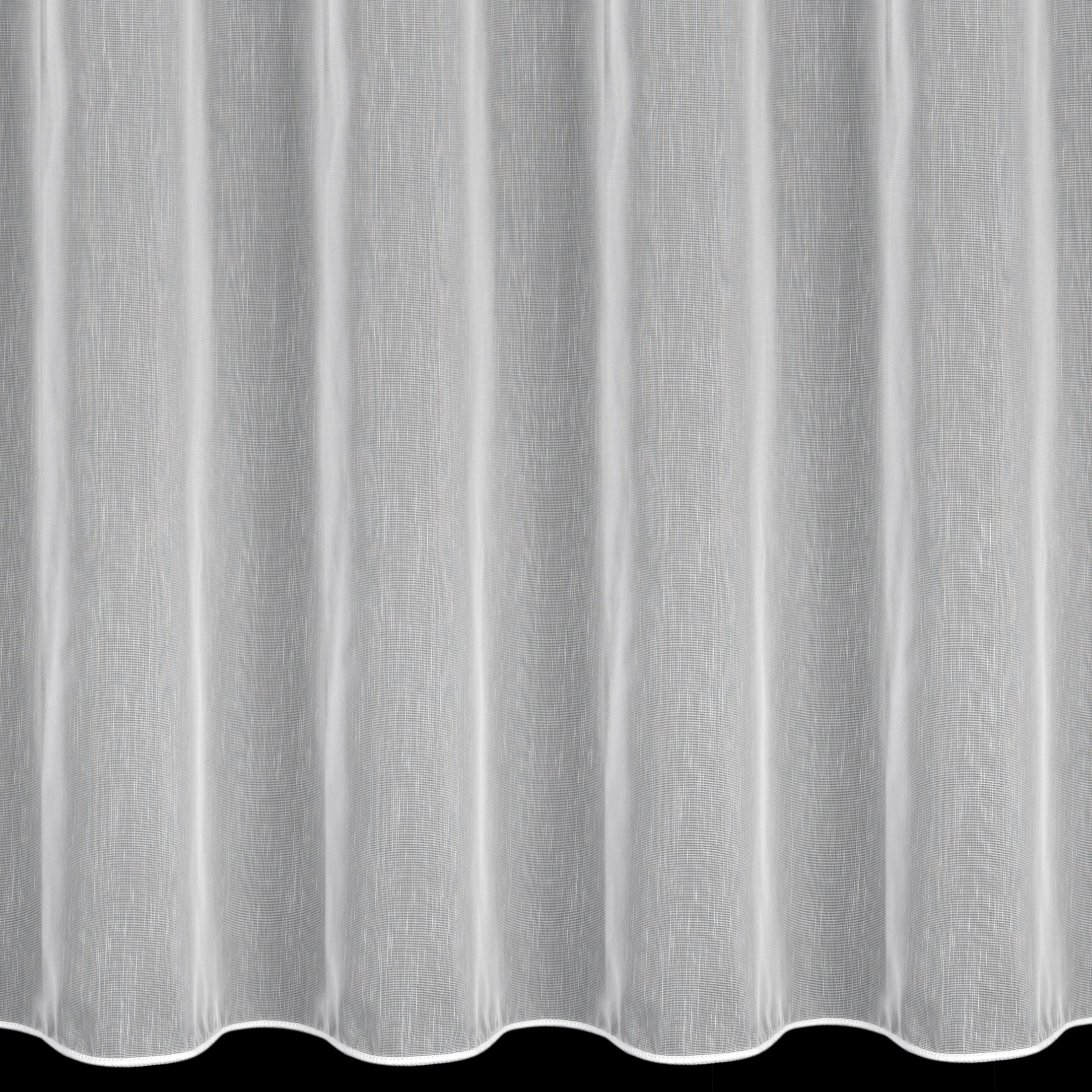 Gładka, matowa tkanina w kolorze białym z subtelnym efektem deszczyku, to tkanina, która sprawdzi się w każdym wnętrzu. Tkanina efektownie się układa, wizualnie odświeża oraz optycznie wycisza wnętrze. Efektownie prezentuje się zarówno sama, jak i w towarzystwie zasłon, których dobór nie nastręcza problemów. Doskonały pomysł na dodatek do wnętrz, w których chcemy przełamać aranżacyjną konwencję – możesz zastosować ją w chłodnym skandynawskim stylu, wzbogacić rustykalną prostotę czy dopasować do klasycznego wnętrza. Materiał delikatnie ogranicza światło słoneczne, a więc z powodzeniem możesz zastosować ją tam, gdzie chcesz uzyskać efekt delikatnego osłonięcia wnętrza. Szew obciążający wszyty w dolnej krawędzi sprawia, że firana świetnie prezentuje się po zawieszeniu w oknie.